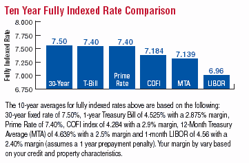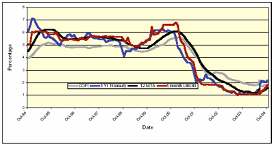 Below is a comparison between the fully indexed 1-month LIBOR, MTA, COFI, Prime Rate and 1-year Treasury Bill indices and a 30-year fixed rate mortgage from February 1994 to January 2004.